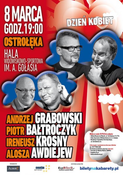 Już 8 marca w Ostrołęce wystąpią polskie gwiazdy kabaretowe: Piotr Bałtroczyk, Andrzej Grabowski, Ireneusz Krosny, Piotr Szwedes i Alosza Awdiejew. Początek występów o godzinie 19 w hali im. Arkadiusza Gołasia.